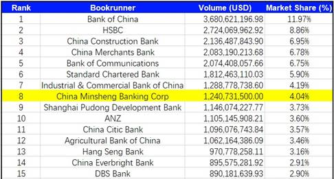 據路透社旗下Refinitiv Loan Connector銀團業務信息平臺近日披露,2020年1-7月香港及澳門地區排行中,民生銀行香港分行擔任銀團貸款簿記行(Bookrunner)項目金額排名第8位,較2019年前進26位;擔任委任牽頭安排行(Mandated Arranger)項目金額排名第12位,較2019年前進4位,市場排名再攀新高!